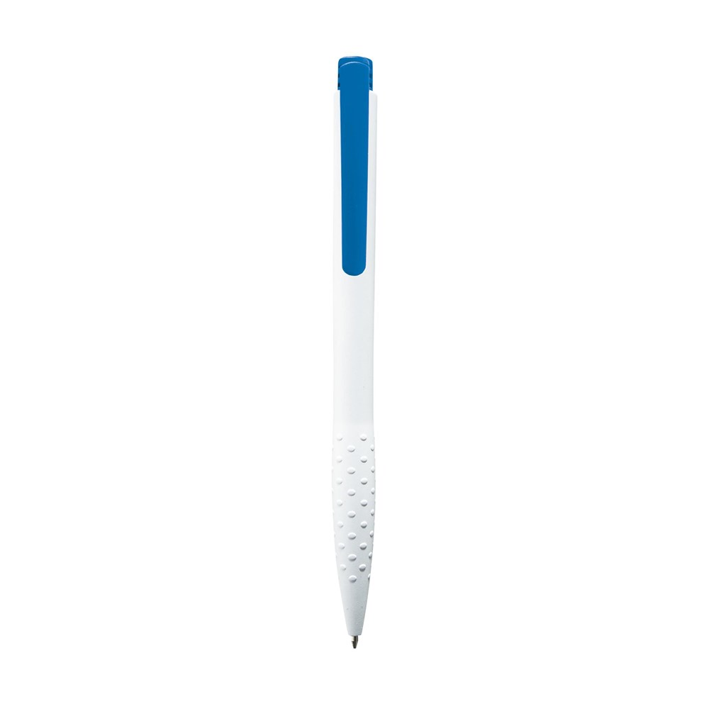 Blue or black ink ballpoint pen with textured grip, coloured clip and push button. more