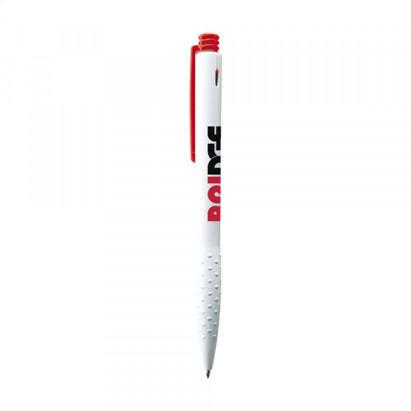 Blue or black ink ballpoint pen with textured grip, coloured clip and push button. more