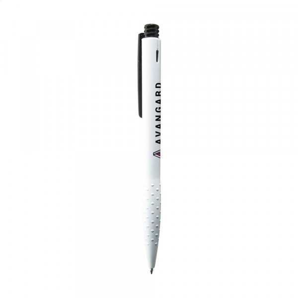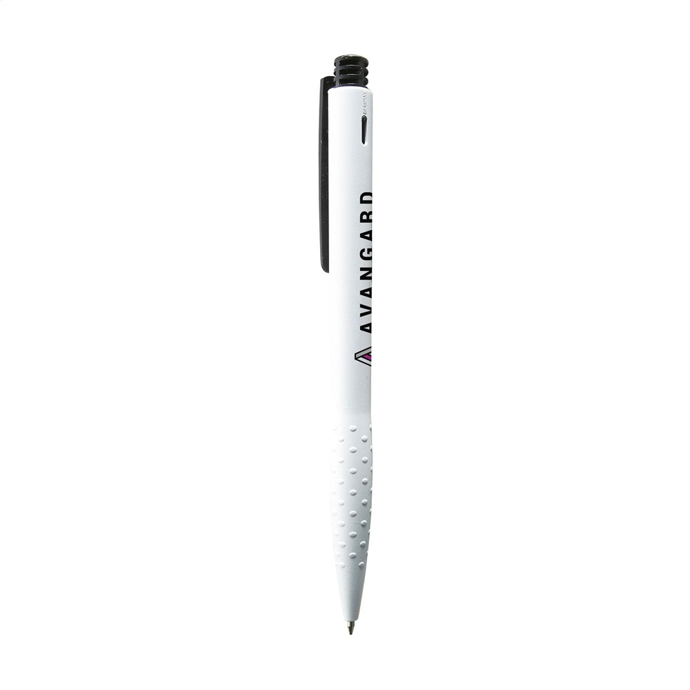 Blue or black ink ballpoint pen with textured grip, coloured clip and push button. more