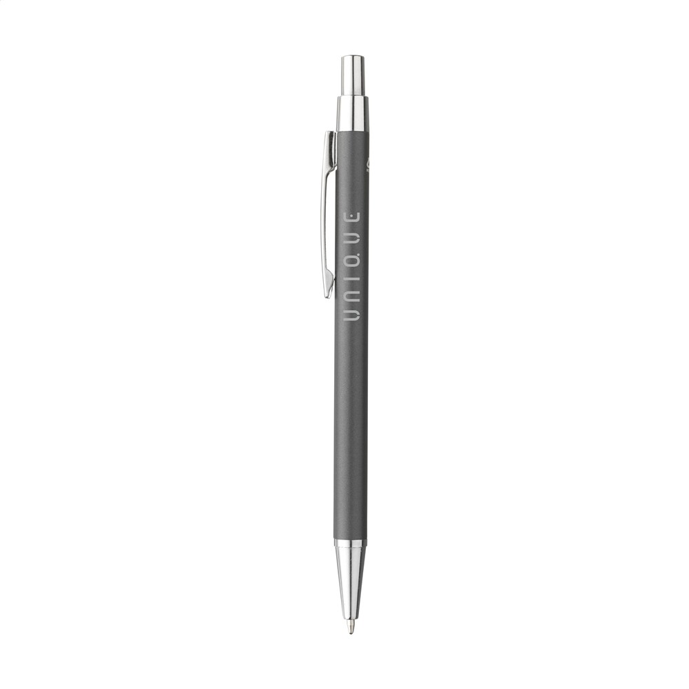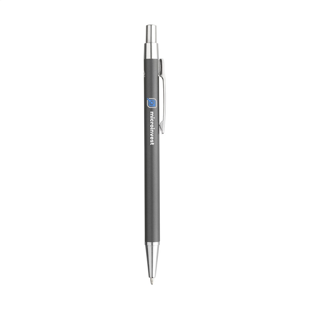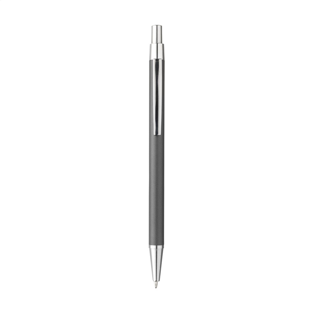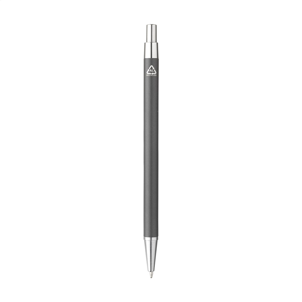 Blue ink ballpoint pen with a slim barrel made from scrap aluminum. The barrel of this pen is made from 85% certified recycled aluminum. Supplied with a sturdy metal clip and push button. By using recycled aluminium, fewer new raw materials are used during the production of this product. This means less energy consumption and less use of water.
