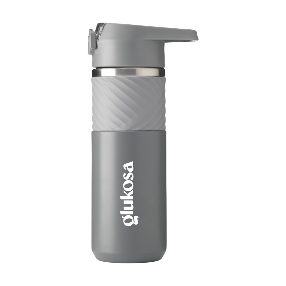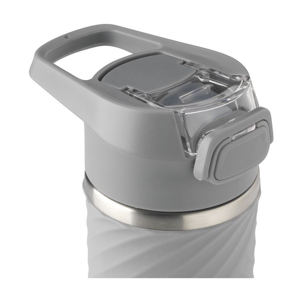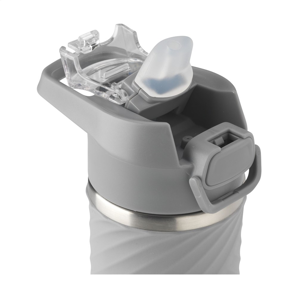 Double-walled water bottle/thermos flask made from recycled stainless steel. With a leak proof PP screw cap, a collapsible silicone drinking spout and a straw. The drinking spout is hygienically closed with a transparent lid, push button and lock. Handy for when exercising and also for use in the car. This bottle does not have to be tilted while drinking and has a generous rubber non-slip grip. The chic yet sturdy design makes this bottle stand out. Suitable for keeping cold or hot drinks at the right temperature. Not dishwasher-safe. RCS-certified, Total recycled material: 68%. Capacity 500 ml. Stainless steel can be recycled many times whilst retaining the quality of the material. By using recycled stainless steel, fewer new raw materials are needed. This means less energy consumption and less use of water. Packed individually.