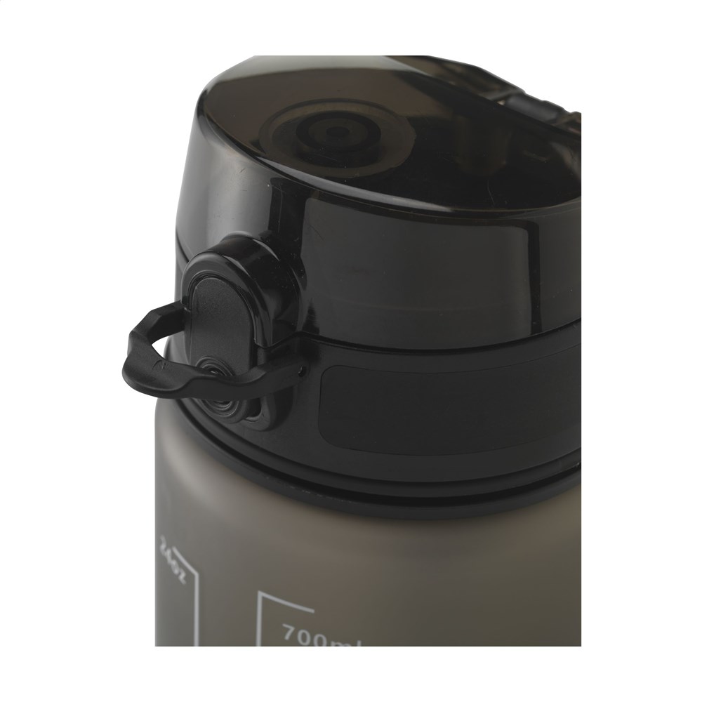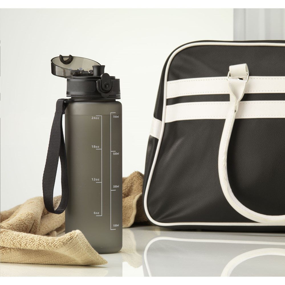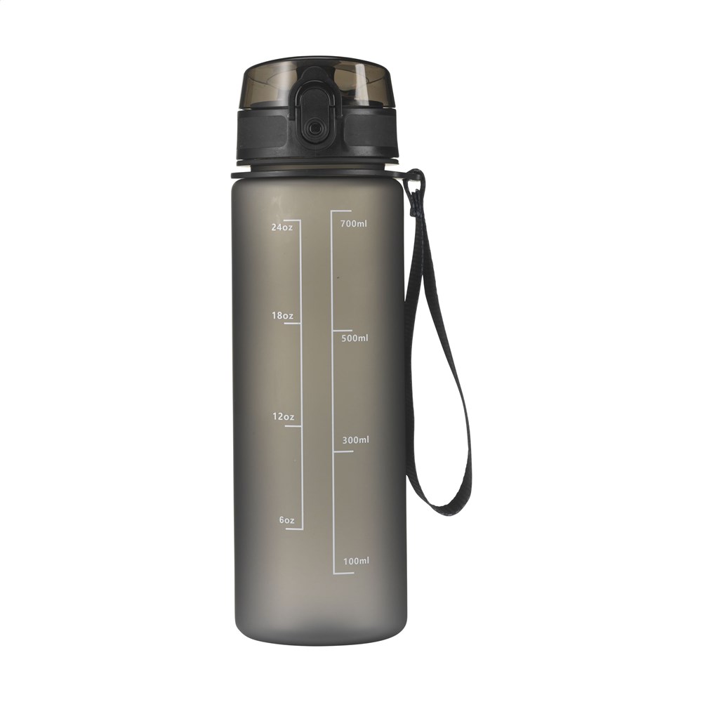 Matte-transparent, plastic water bottle with leak proof screw cap and handy carrying loop. The screw cap has a drinking spout and is hygienically closed with a transparent lid with push button and lock. With indication of the contents in ml and oz on the outside of the bottle. Not dishwasher safe. Capacity 750 ml.