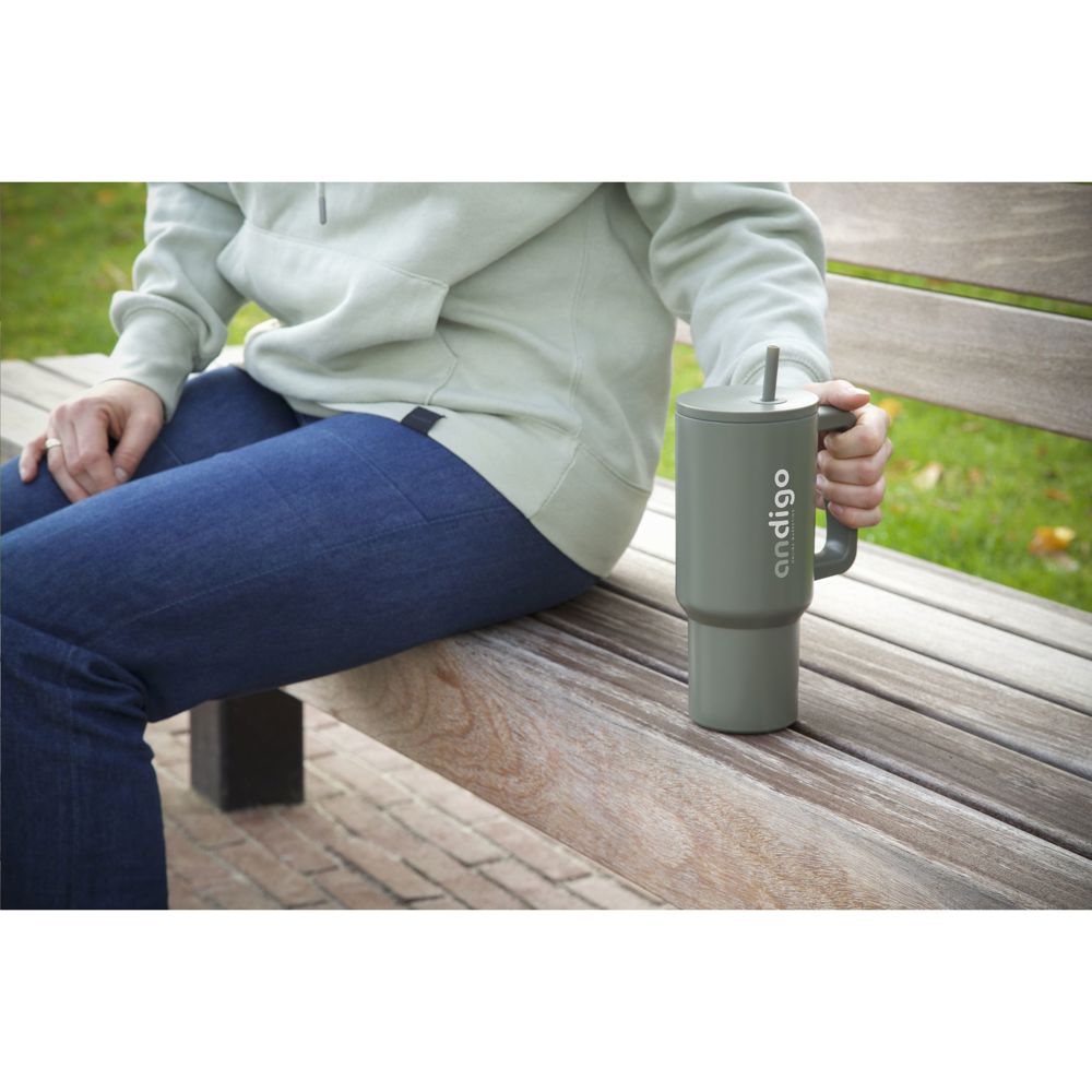 Large, double-walled drinking cup made from recycled stainless steel with straw. The striking, sturdy mug has a large, plastic handle and a screw-on lid with an opening for the included plastic straw. This huge mug keeps drinks at temperature for longer periods of time. Suitable for cold and hot drinks. Without a straw, the temperature is not lost thanks to the silicone seal in the lid. This mug can go anywhere. Ideal for the gym or the office. Thanks to the conical, narrow bottom, the cup fits in almost any cup holder, making it perfect for on the go. Not dishwasher-safe. RCS-certified. Total recycled material: 75%. Capacity 900 ml. Packed individually.