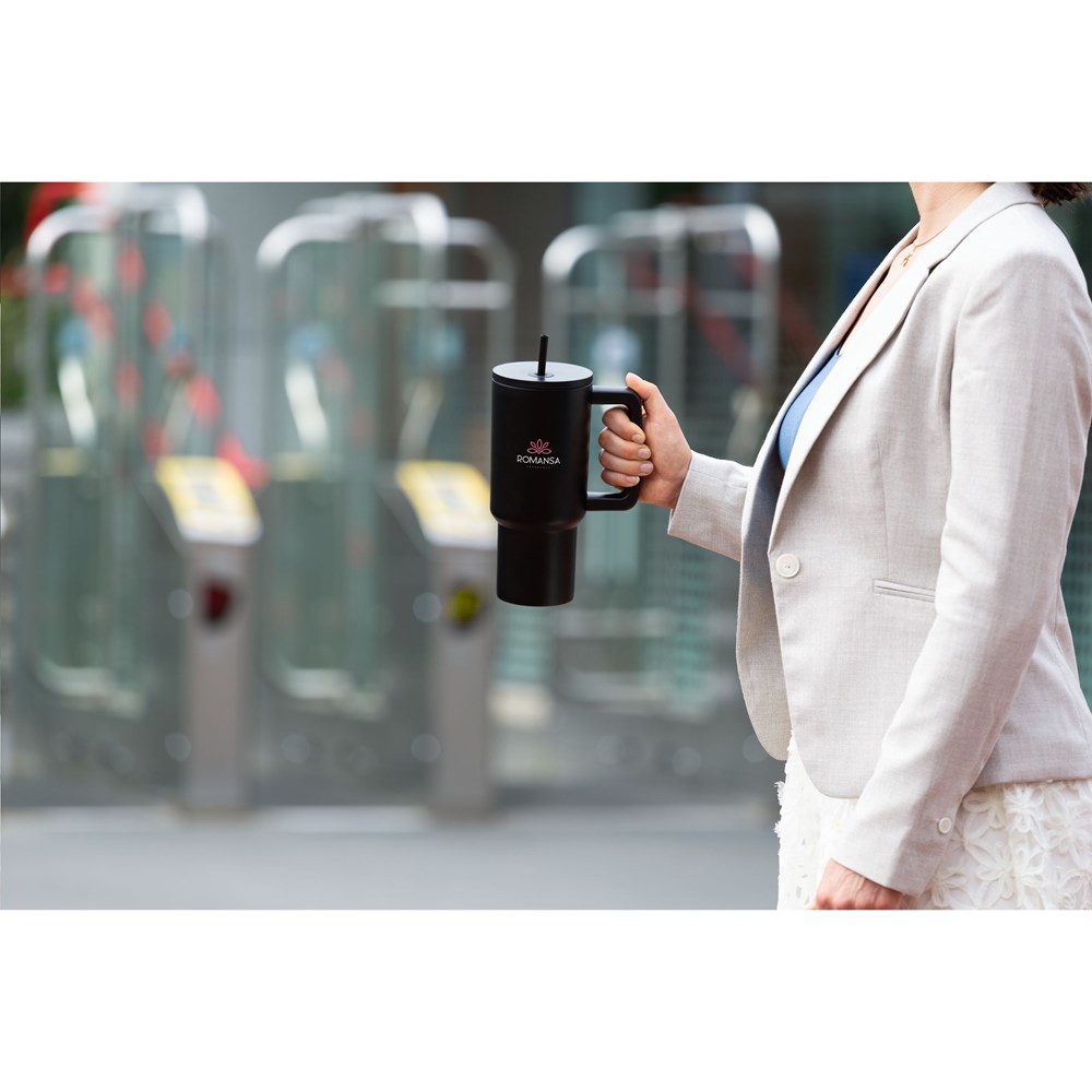 Large, double-walled drinking cup made from recycled stainless steel with straw. The striking, sturdy mug has a large, plastic handle and a screw-on lid with an opening for the included plastic straw. This huge mug keeps drinks at temperature for longer periods of time. Suitable for cold and hot drinks. Without a straw, the temperature is not lost thanks to the silicone seal in the lid. This mug can go anywhere. Ideal for the gym or the office. Thanks to the conical, narrow bottom, the cup fits in almost any cup holder, making it perfect for on the go. Not dishwasher-safe. RCS-certified. Total recycled material: 75%. Capacity 900 ml. Packed individually.