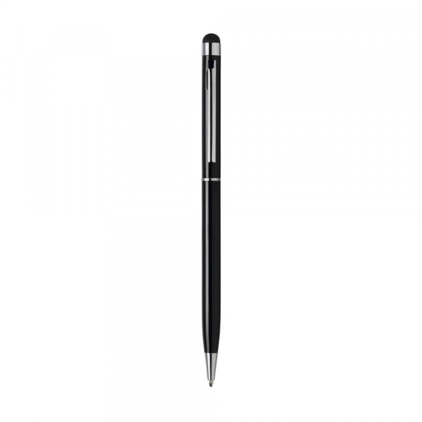 Blue ink, metal ballpoint pen with rubber top/pointer to operate touch screens (eg iPhone/iPad), gloss accents and twist mechanism.