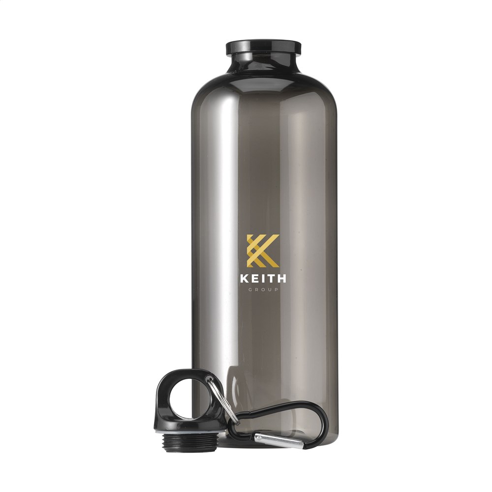 Reusable, recycled water bottle. The body is made from 100% RPET. With a plastic screw cap and a aluminium carabiner to easily attach the bottle to your bag or backpack. The carabiner is not to be used for climbing. You can take this ideal lightweight bottle with you everywhere. Only suitable for cold water. Leak proof. Not dishwasher-safe. Total recycled material: 83%. Capacity 630 ml.