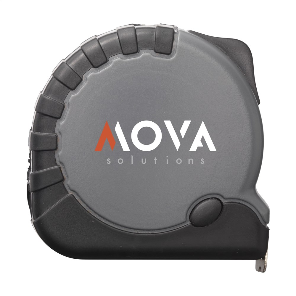 Tape measure made from recycled ABS plastic. With hardened steel strap (band width 19 mm) and measure displayed in both centimetres and inches. Comes with non-slip rubber housing, belt clip and wrist strap. Packed individually.