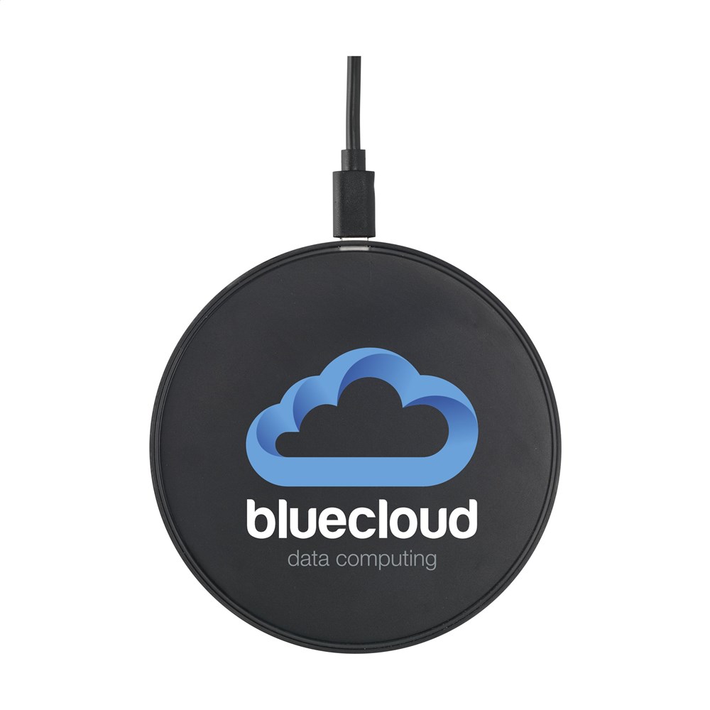 10W wireless charger. The casing is made from recycled ABS plastic. Compatible with all mobile devices that support QI wireless charging (latest generation Android and iPhone 8 and above). Input: 9V/1.1A. Wireless output: 9V/1.1A 10W. Includes USB-C/USB-C charging cable and user manual. This product and its accessories are PVC-free. RCS-certified. Total recycled material: 20%. Packed individually.