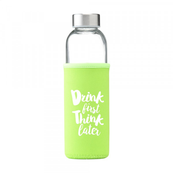 Slim, leak proof water bottle made of soda-lime glass with stainless steel screw cap. With neoprene sleeve to carry the bottle comfortably. The glass bottle is dishwasher safe with the exception of the screw cap. Capacity 500 ml. Packed individually.