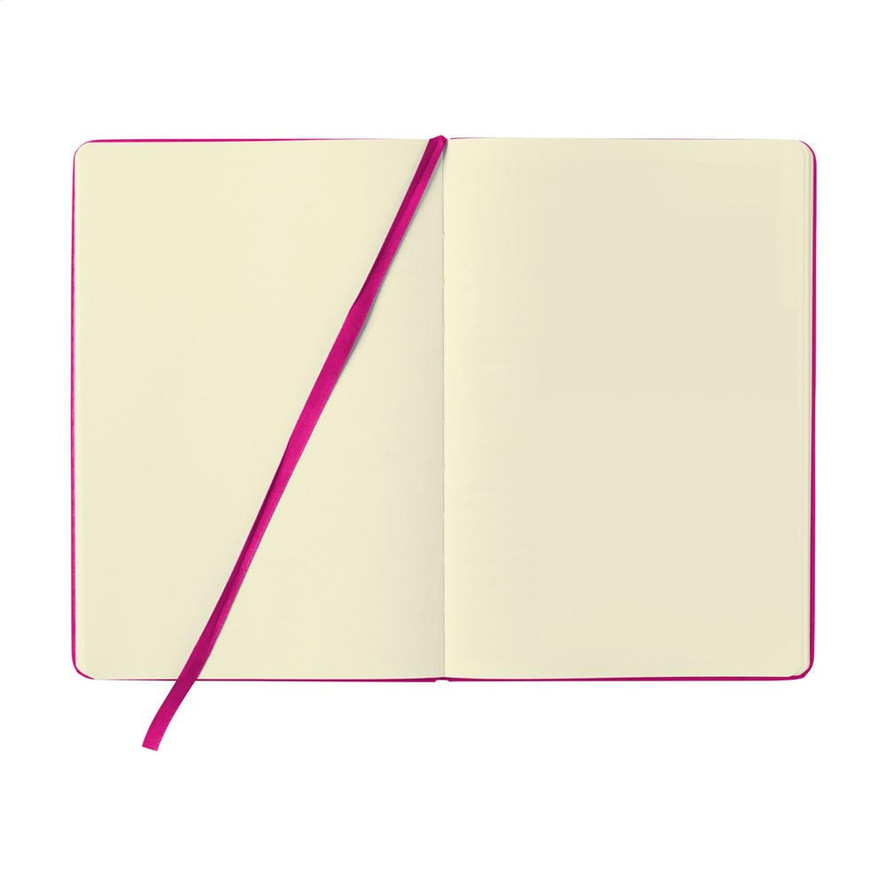 Practical notebook in A5 format. With hard PU cover, approx. 80 blank sheets/160 pages of cream coloured, unlined FSC Mix certified paper (70 g/m²), elastic closure and ribbon marker.