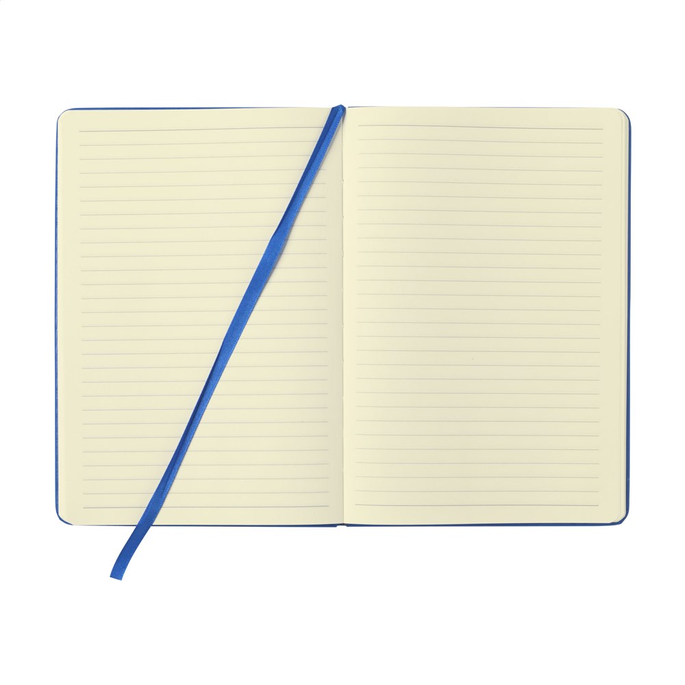 Practical notebook in A5 format. With hard PU cover, approx. 80 sheets/160 pages of cream coloured, lined FSC Mix certified paper (70 g/m²), elastic closure and ribbon marker.