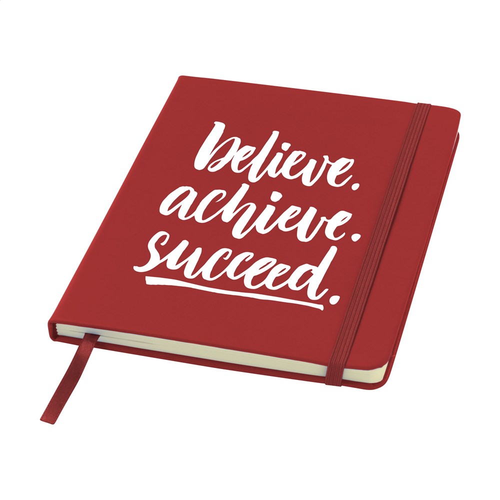 Practical notebook in A5 format. With hard PU cover, approx. 80 sheets/160 pages of cream coloured, lined FSC Mix certified paper (70 g/m²), elastic closure and ribbon marker.