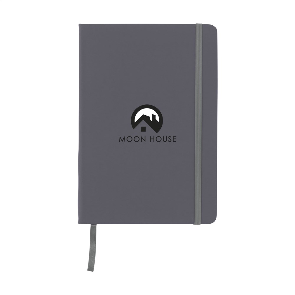 Practical notebook in A5 format. With hard PU cover, approx. 80 sheets/160 pages of cream coloured, lined FSC Mix certified paper (70 g/m²), elastic closure and ribbon marker.