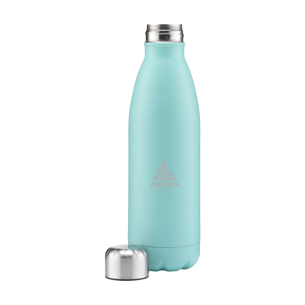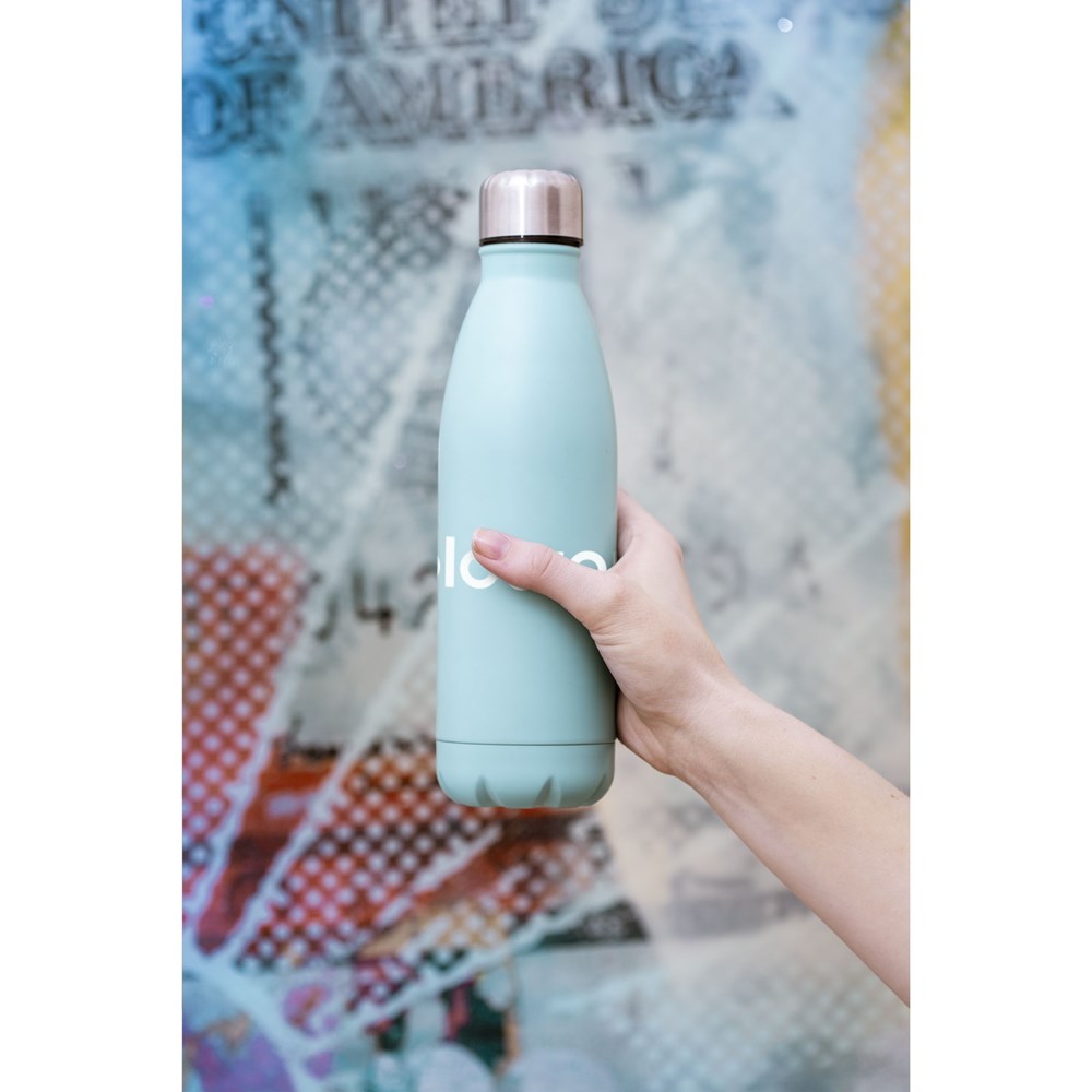 Single-walled stainless steel water bottle with leak proof screw cap. Not dishwasher-safe. Capacity 750 ml.