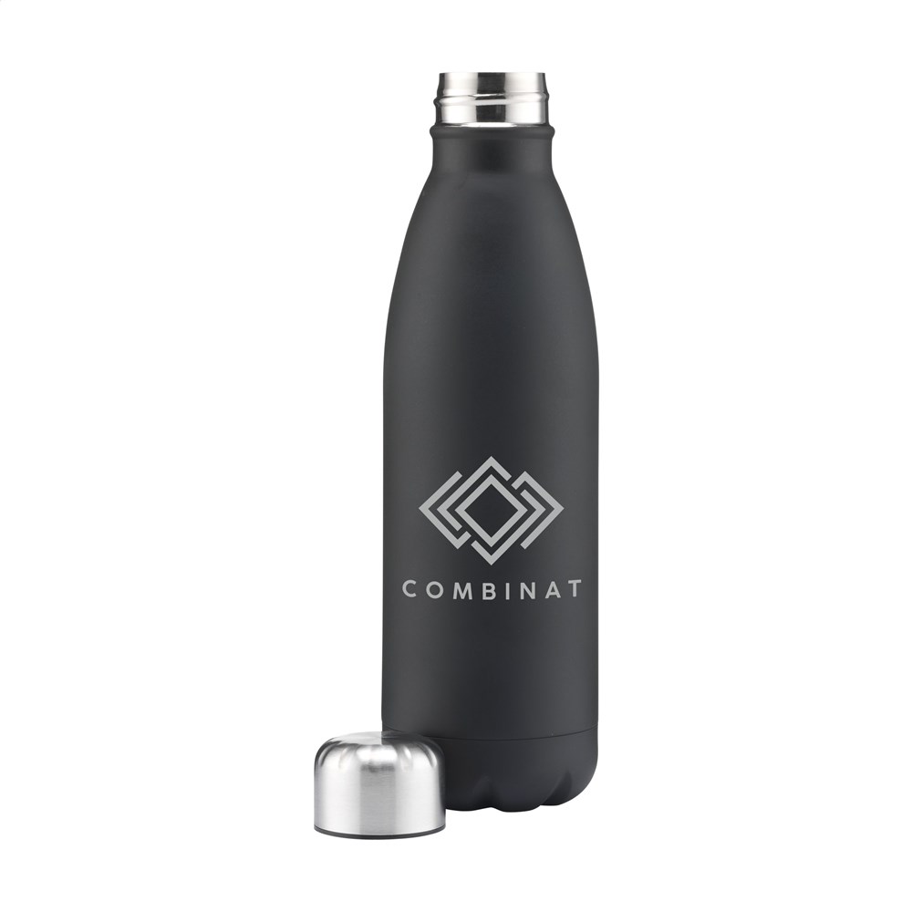 Single-walled stainless steel water bottle with leak proof screw cap. Not dishwasher-safe. Capacity 750 ml.