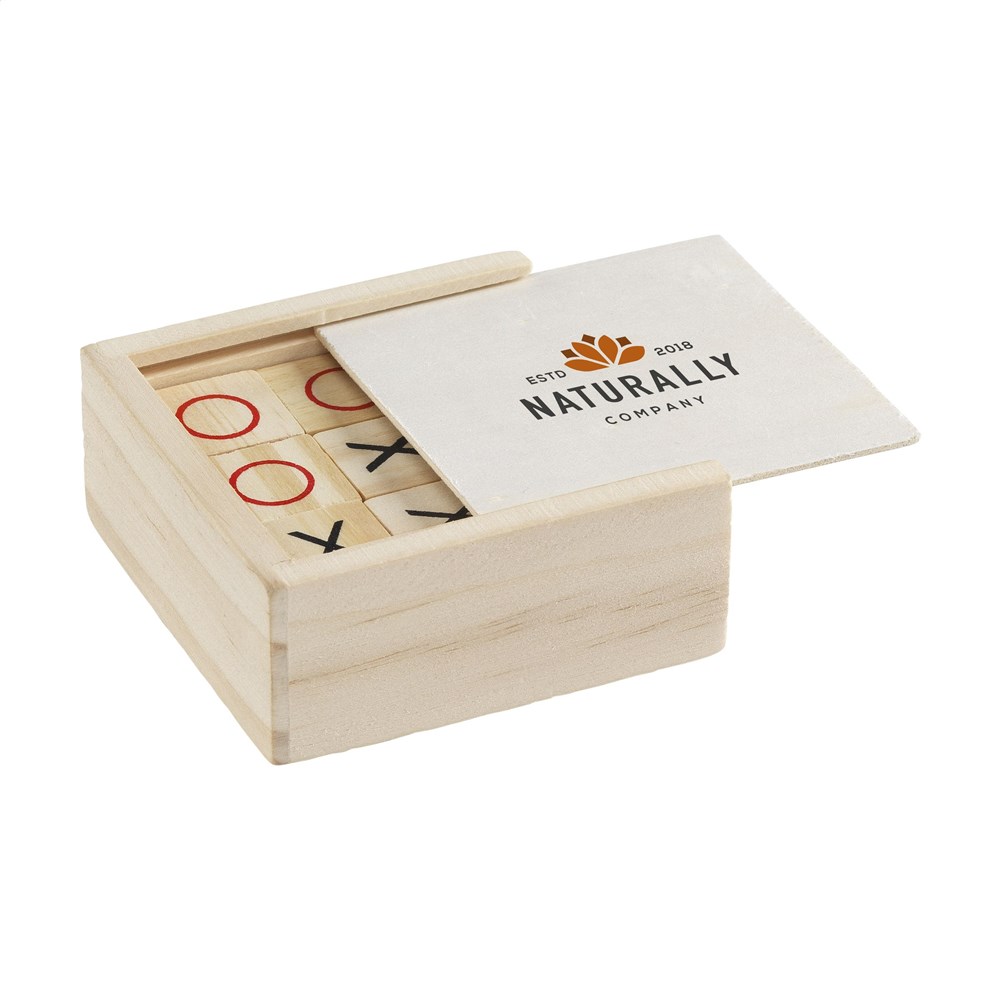 The well-known 'tic tac toe' game, in a wooden game format. 9 blocks of FSC 100% certified bamboo are provided in the shapes of circles and crosses. Who will be the first to make a row of three identical shapes? A fun game for young and old. The blocks are stored in a handy FSC certified pinewood storage box with a sliding lid. Incl. instructions.