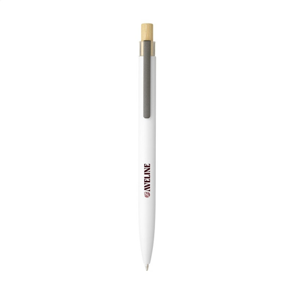 Fashionable, blue ink ballpoint pen with a barrel made from 100% recycled aluminium, with a matte finish. The bamboo push button has a transparent accent. The barrel consists of one piece and is standard printed with the 'recycled aluminium logo'. GRS-certified. By using recycled aluminium, fewer new raw materials are used during the production of this product. This means less energy consumption and less use of water.