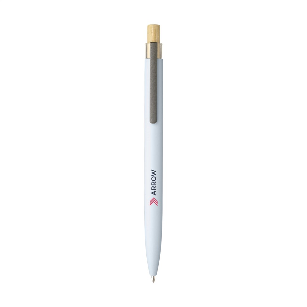 Fashionable, blue ink ballpoint pen with a barrel made from 100% recycled aluminium, with a matte finish. The bamboo push button has a transparent accent. The barrel consists of one piece and is standard printed with the 'recycled aluminium logo'. GRS-certified. By using recycled aluminium, fewer new raw materials are used during the production of this product. This means less energy consumption and less use of water.
