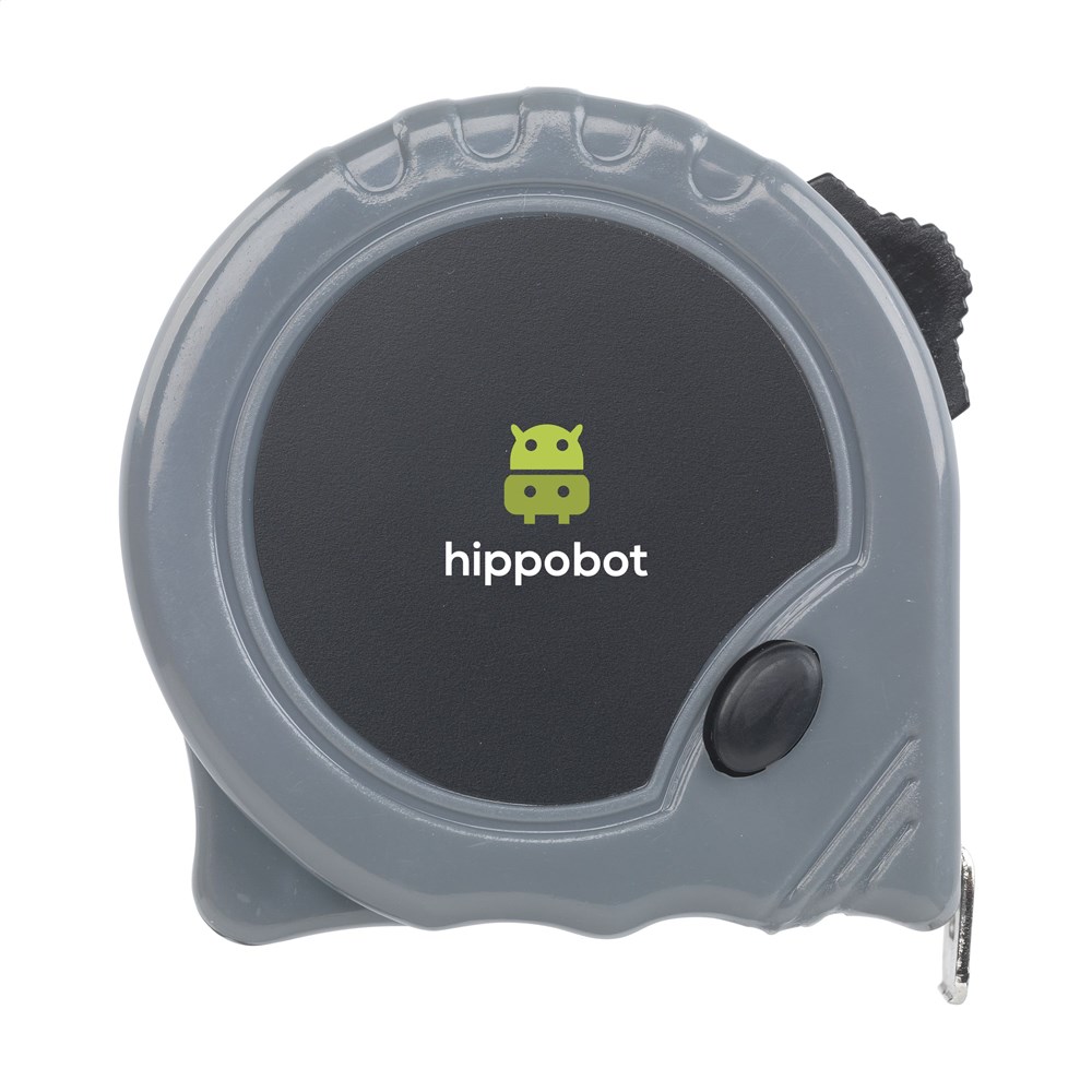 Tape measure made from recycled ABS plastic. The hard steel measuring band has a length of 3 meters and a width of 1.6 cm. Measurement is in centimetres. This tape measure has a belt clip and polyester wrist strap. Calibrated according to European standards. RCS-certified. Total recycled material: 20%. Packed individually.