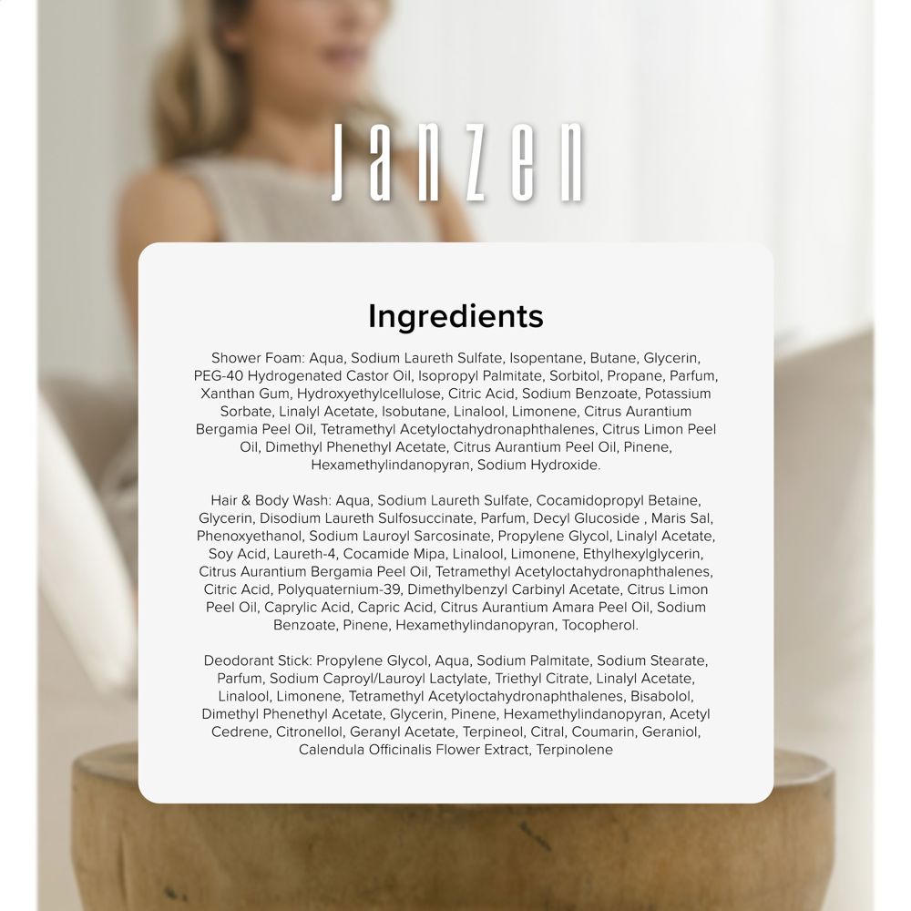 A gift set from the JANZEN brand, specially put together for men, with 3 care products for pleasant skin and hair care. Contents: • Shower Foam - 200 ml • Hair & Body Wash - 200 g • Deodorant Stick - 75 ml. This gift set with fine care products ensures that the day starts fresh and full of confidence. With the delicious scent of bergamot and cedarwood, complemented by notes of citrus, nutmeg and musk. The products are packaged in a luxurious gift box. Each set is supplied in an individual gift box.