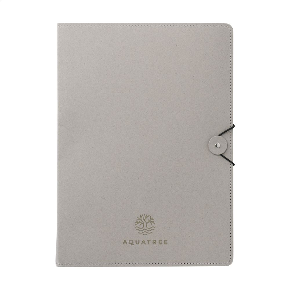 Trendy conference/document folder made from high-quality, sturdy FSC 100% certified cardboard (650 g/m²). With 2 slip pockets on the inside. The right-hand slip pocket is for the included writing pad with approx. 30 sheets of lined, FSC 100% certified paper (70 g/m²). Suitable for A4 documents. The folder is beautifully stitched all around and has a striking elastic closure. This folder protects documents and is suitable for business, study or private purposes.