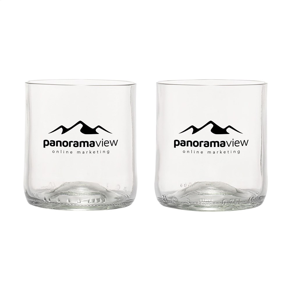 Set of Rebottled® design drinking glasses made from upcycled wine bottles. Unique glasses in which you immediately recognise the original wine bottle. The glasses fit comfortably in your hand and have a smooth finish. Of high quality and suitable for water, soft drinks or wine. Dishwasher-safe up to 60C°. Washing by hand is recommended to preserve the imprint. Per set delivered in an original gift box made from recycled FSC®-certified cardboard. Dutch design. Made in Holland. Capacity approx. 250 ml per glass. Imprint only possible in black or white. Rebottled® upcycles empty wine bottles into 100% circular design items. Packed per set.
