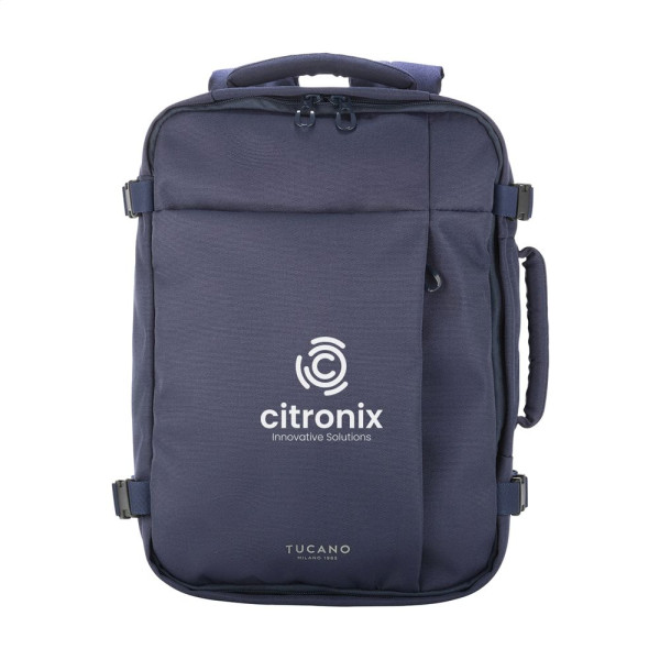 Cabin travel backpack from the Italian brand Tucano. This backpack meets the size requirements of all low-cost airlines. The backpack is made with fabric produced from recycled plastic, including 24 recycled PET bottles. The main compartment is large and spacious, ideal for clothing and accessories. The zip closure has lockable zip pulls, so you can secure the main compartment with any suitable padlock (not included). The backpack also has an internal AirTag holder. The padded, shock-resistant back pocket is suitable for carrying laptops up to 15.6 inch or MacBook Pro 16 inch. Fully lined. The adjustable, padded shoulder straps and padded back ensure extra comfort. With a handy trolley strap and extra zip pocket on the back, ideal for storing personal documents. Enjoy perfect portability with two handles, one on the top and one on the side. This backpack is designed to meet the cabin dimensions of all airlines. It fits under the seat on the aeroplane, making it the ideal travel companion for air travel. Capacity approx. 23 litres.