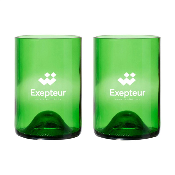 Set of Rebottled® design drinking glasses made from upcycled wine bottles. Unique glasses in which you immediately recognise the original wine bottle. The glasses fit comfortably in your hand and have a smooth finish. Of high quality and suitable for water, soft drinks or cocktails. Dishwasher-safe up to 60C°. Washing by hand is recommended to preserve the imprint. Per set delivered in an original gift box made from recycled FSC®-certified cardboard. Dutch design. Made in Holland. Capacity approx. 400 ml per glass. Imprint only possible in black or white. Rebottled® upcycles empty wine bottles into 100% circular design items. Packed per set.