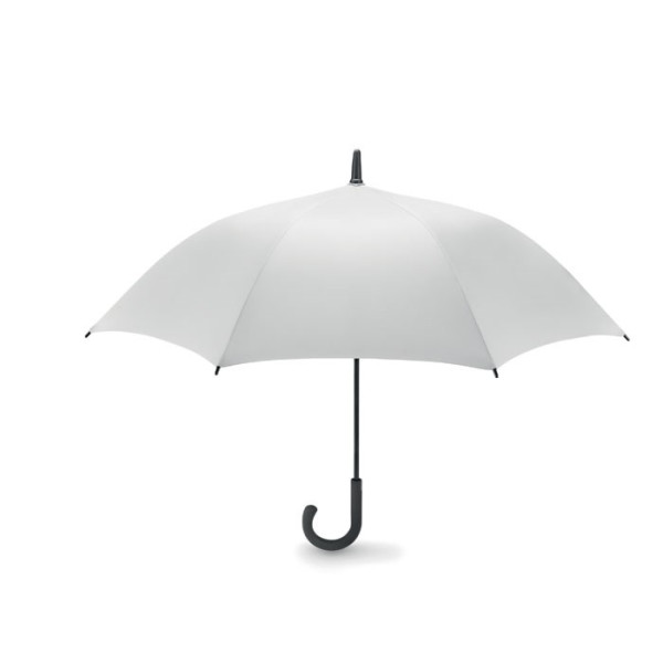 23 Inch auto open windproof umbrella in 190T pongee with black plated metal shaft. Black fiberglass ribs and black plastic tips. Curved black rubberised ABS handle with grey button. Manual closure.