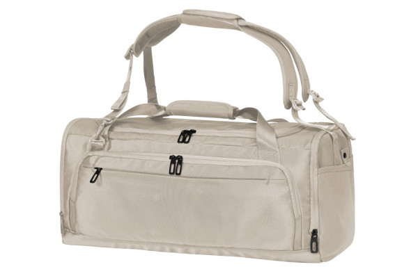 comfortable sports and travel bag with backpack function; recycled outer fabric; large main compartment with 2-way zipper opening; side zipper pocket including shoe bag; front: large front pocket with 2-way zipper opening plus flat zip pocket; inside: hanging zip organizer and spacious zip lid pocket; padded bottom; mesh side pocket for storing the adjustable, removable and padded shoulder straps – ergonomically shaped and usable either as backpack or shoulder strap; carrying handles with padded grip cuff