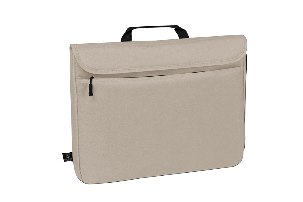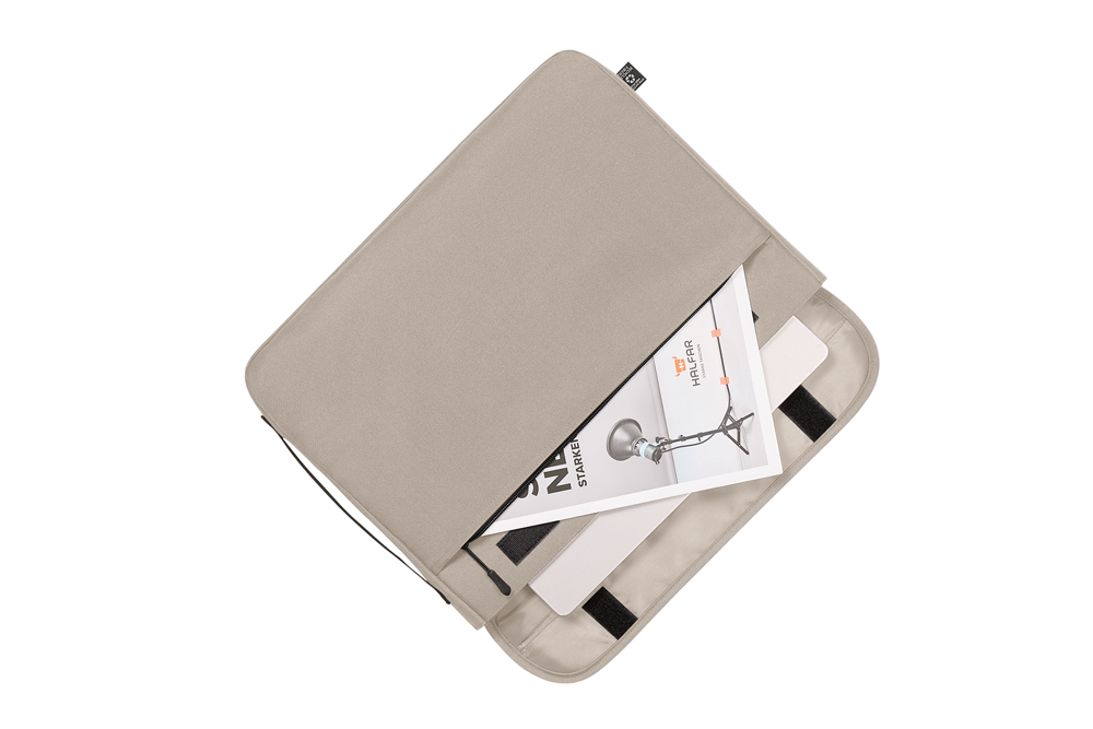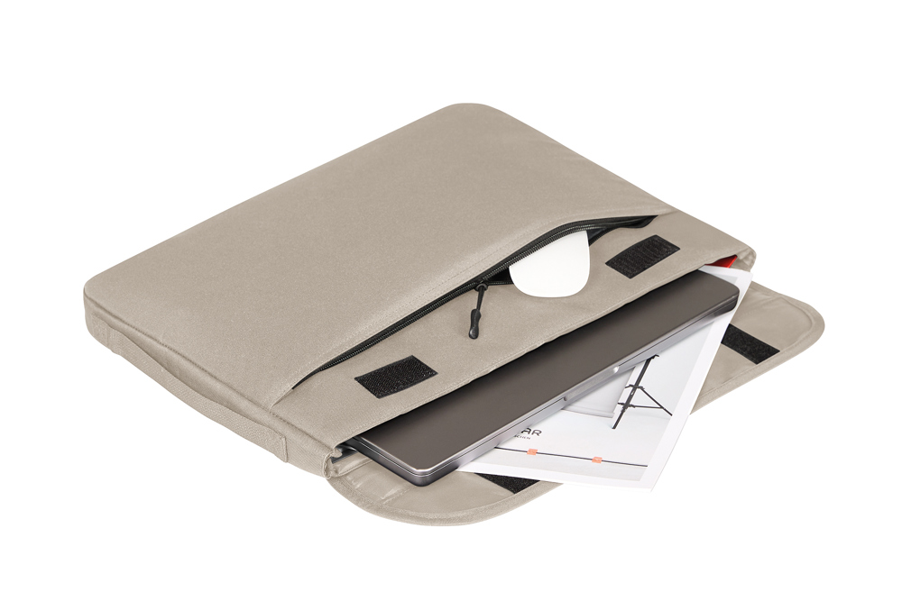 elegant laptop sleeve made of recycled fabric; padded main compartment; padded flap with hook-and-loop fastener; large front pocket with zipper; inner AirTag compartment; back loops for attaching individual accessories, e.g. shoulder strap (not included); ergonomic rear handle, also suitable for fastening to trolley bar; flat side handle for easy lifting, e.g. from backpacks