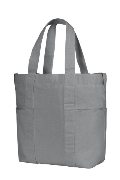 mono-material wellness shopper made of heavy organic cotton; side tabs for attaching objects, e.g. pendants, carabiners, etc.; four side pockets on the outside; hanging organizer with envelope closure inside; stable circumferential shoulder straps