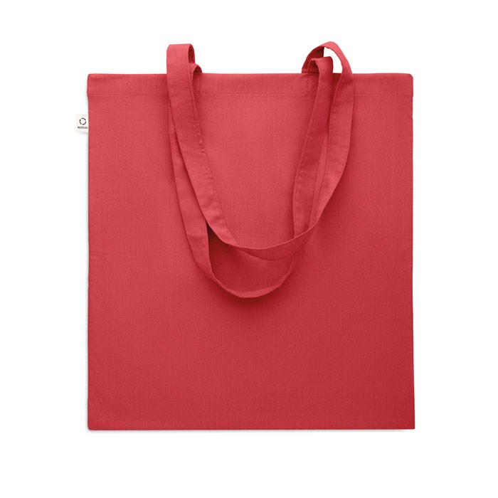 Recycled pre-consumer cotton shopping bag (70% recycled cotton and 30% RPET) with long handles. 140 gr/m². This item can shrink after printing.