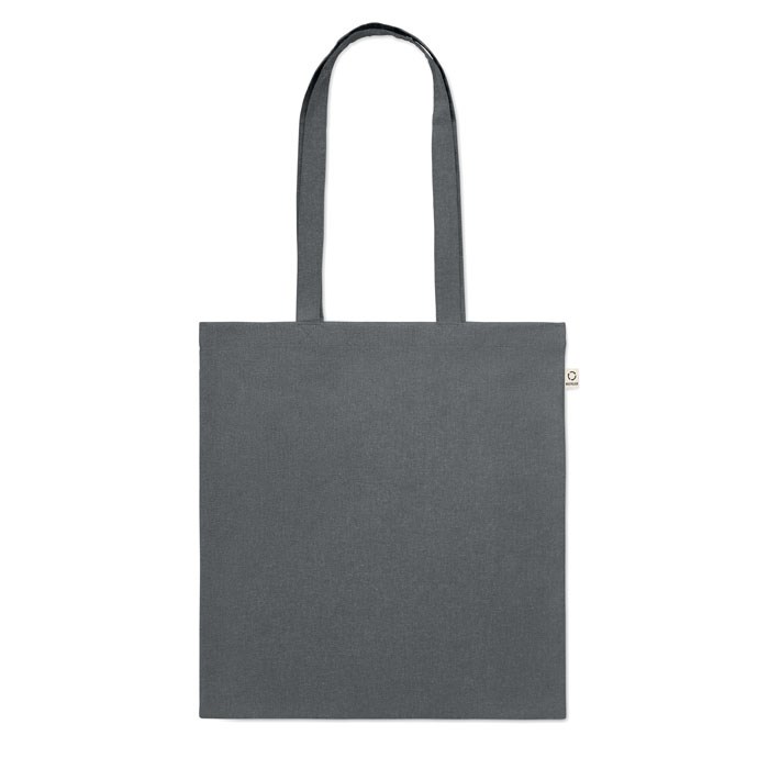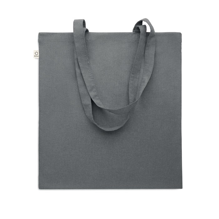 Recycled pre-consumer cotton shopping bag (70% recycled cotton and 30% RPET) with long handles. 140 gr/m². This item can shrink after printing.