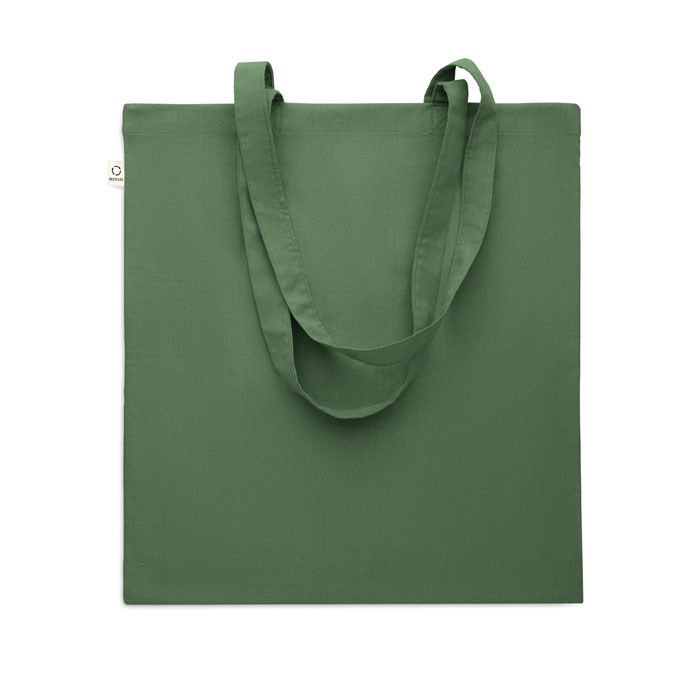 Recycled pre-consumer cotton shopping bag (70% recycled cotton and 30% RPET) with long handles. 140 gr/m². This item can shrink after printing.