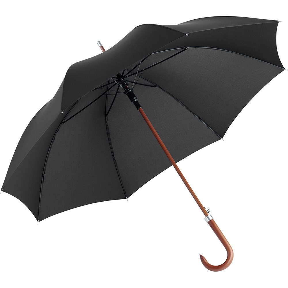 Elegant automatic golf umbrella for two people with genuine wooden shaft and handle Convenient automatic function for quick opening, Windproof system for higher frame flexibility and stability in windy conditions, flexible fibreglass ribs, shaft made of genuine wood in dark brown colour, water-saving coloured polyester pongee waterSAVE® cover material made from recycled plastics, with waterSAVE® label on the closing strap, elegant crook handle made of genuine wood, large, accommodating diameter