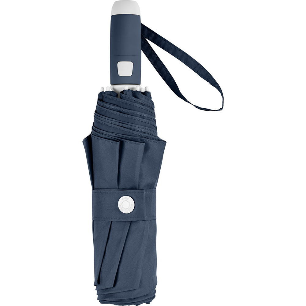 Stylish automatic open/close pocket umbrella with white design elements Convenient automatic open/close function for quick opening and closing, high-quality Windproof PLUS system for maximum frame flexibility in strong gusts of wind, flexible fibreglass ribs with white design elements, robust steel shaft, polyester pongee cover material made from recycled plastics, attractive soft-feel handle with carrying strap in the cover colour and white design elements with integrated push-button and promotional labelling option