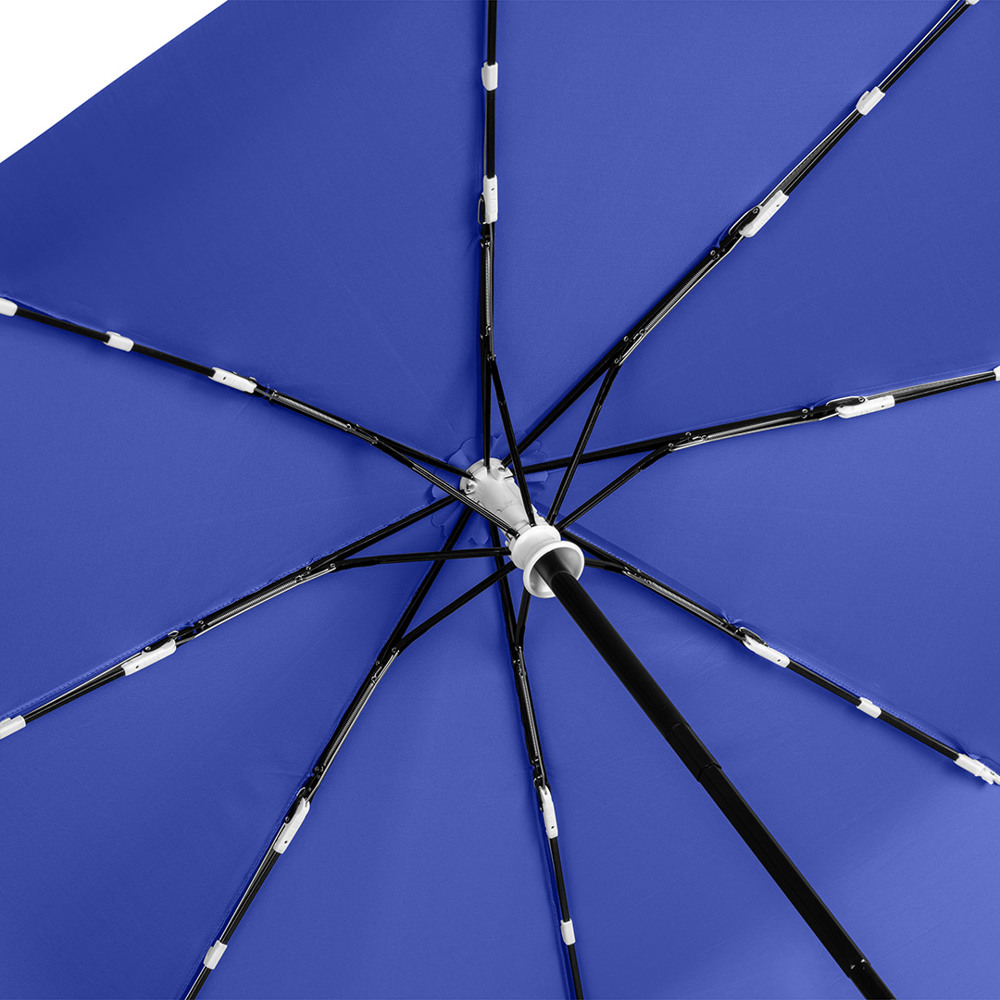Stylish automatic open/close pocket umbrella with white design elements Convenient automatic open/close function for quick opening and closing, high-quality Windproof PLUS system for maximum frame flexibility in strong gusts of wind, flexible fibreglass ribs with white design elements, robust steel shaft, polyester pongee cover material made from recycled plastics, attractive soft-feel handle with carrying strap in the cover colour and white design elements with integrated push-button and promotional labelling option