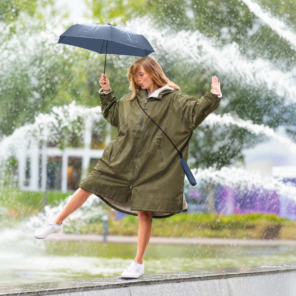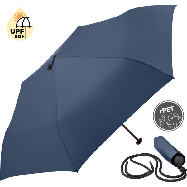 Super-lightweight manual opening pocket umbrella with removable strap and UV protection Easy to use thanks to safety runner, high-quality Windproof PLUS system for maximum frame flexibility in strong gusts of wind, black aluminium shaft, extra-light polyester pongee cover material made from recycled plastics with UPF 50+ sun protection factor, plastic handle, cap and lanyard click fastener made from recycled ABS (rABS), handle with promotional labelling option, carrying strap can be attached to the sleeve or the umbrella with a click fastener, easy to roll up the umbrella thanks to wide closing strap