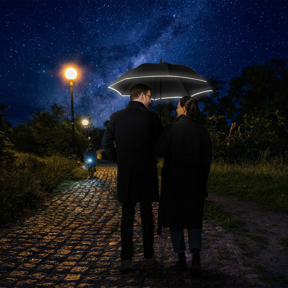 Smart medium-sized regular umbrella with fashionable reflective piping Convenient automatic function for quick opening, high-quality Windproof PLUS system for maximum frame flexibility in strong gusts of wind, flexible fibreglass ribs, robust black galvanised steel shaft, cover with stylish silver reflective piping, polyester pongee cover material made from recycled plastics, environmentally friendly thanks to original waterSAVE® cover material, with waterSAVE® label on the closing bar, soft-feel crook handle with promotional labelling option