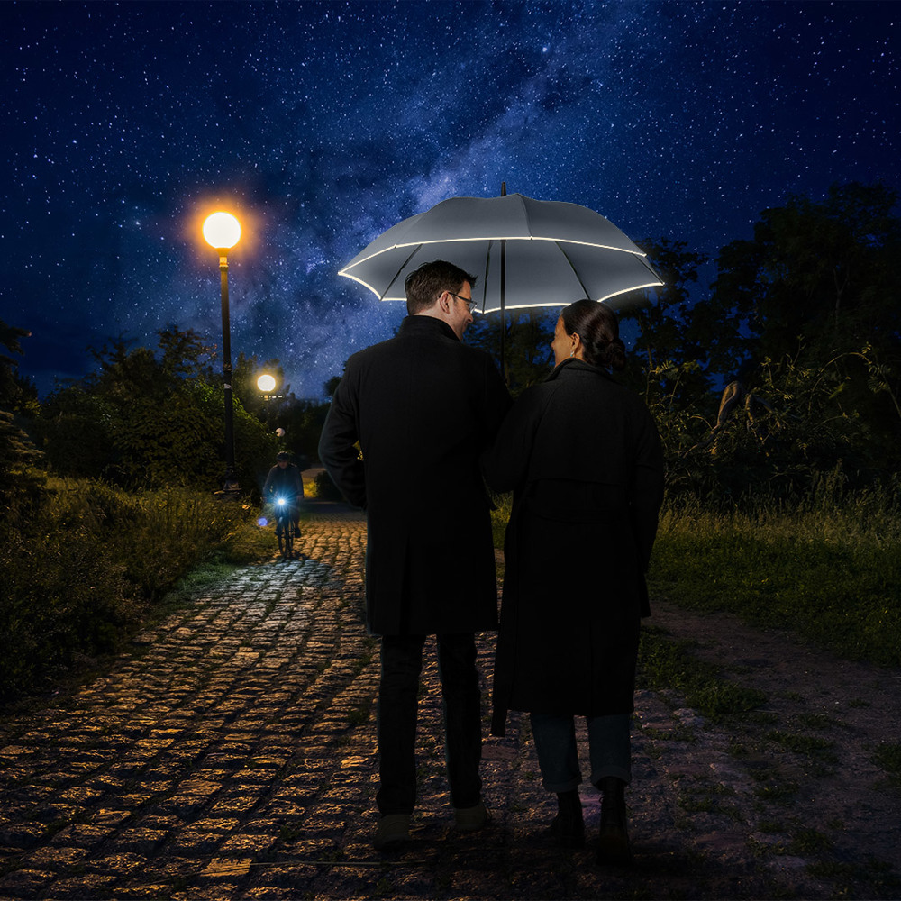 Smart medium-sized regular umbrella with fashionable reflective piping Convenient automatic function for quick opening, high-quality Windproof PLUS system for maximum frame flexibility in strong gusts of wind, flexible fibreglass ribs, robust black galvanised steel shaft, cover with stylish silver reflective piping, polyester pongee cover material made from recycled plastics, environmentally friendly thanks to original waterSAVE® cover material, with waterSAVE® label on the closing bar, soft-feel crook handle with promotional labelling option