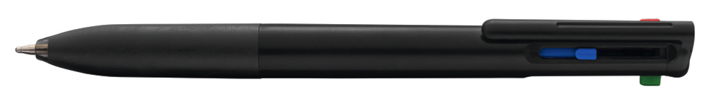 Four-colour ballpoint pen with black, red, blue and green inks, featuring a rubber grip zone. Solid-coloured barrel with coloured sliders matching each ink colour.