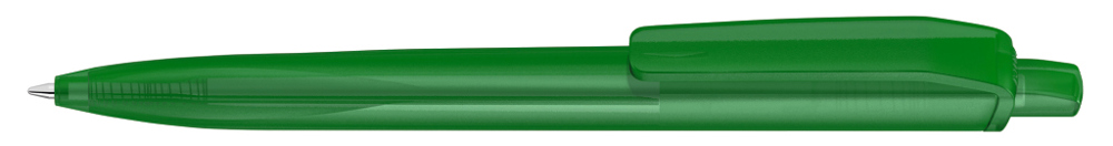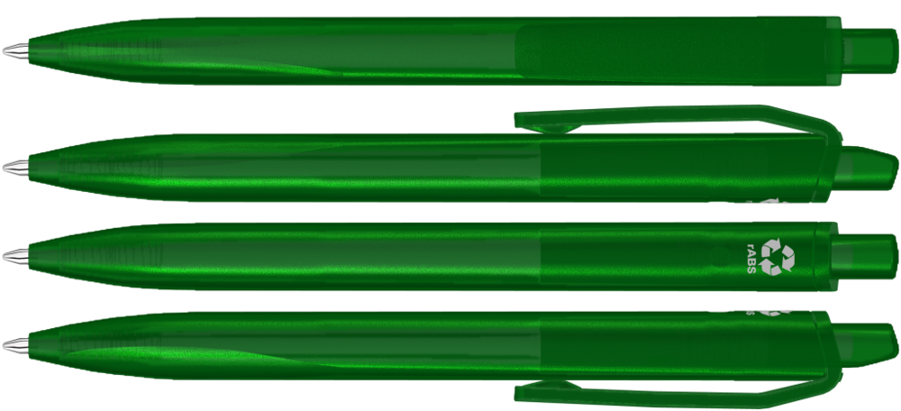 Retractable ballpoint pen with transparent frosted housing, clip and push-button made from recycled ABS plastic. Ergonomically shaped grip zone.