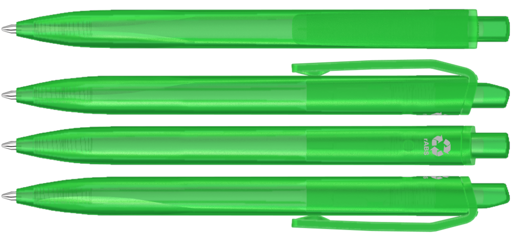 Retractable ballpoint pen with transparent frosted housing, clip and push-button made from recycled ABS plastic. Ergonomically shaped grip zone.