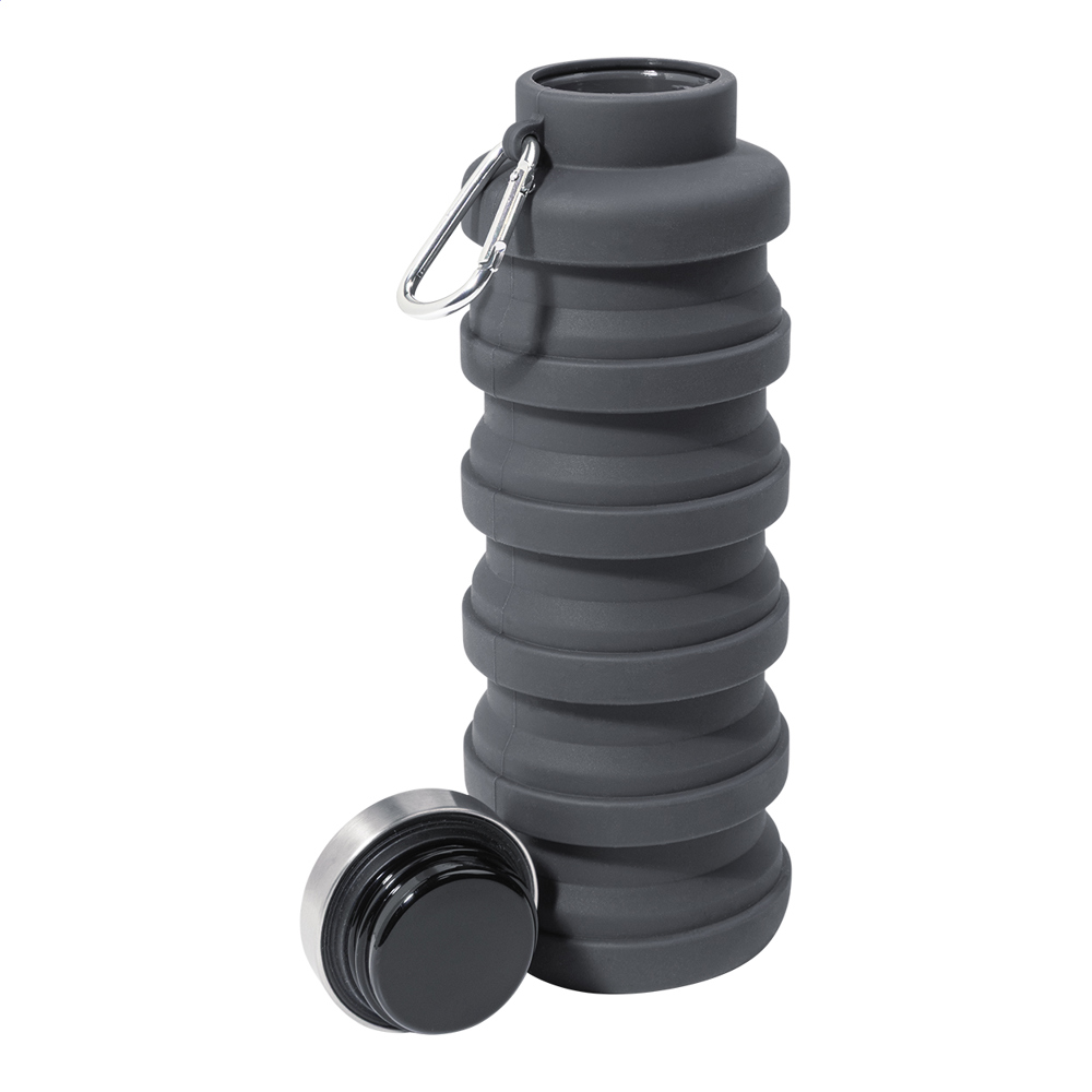 Collapsible silicone bottle with stainless steel lid and aluminium carabiner. 500 ml.