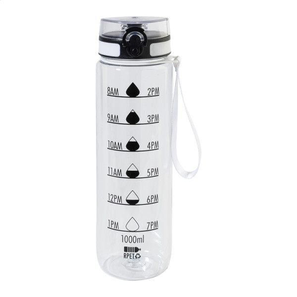 Frosted RPET sport bottle with motivational volume and time markings, featuring an auto-open flip-top drinking lid with safety lock and carry strap. 1000 ml. BPA-free. Not suitable for carbonated drinks.