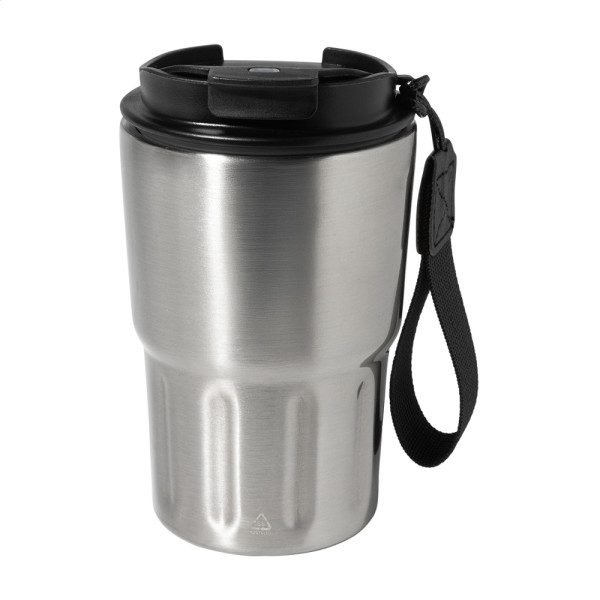 Double-wall, recycled stainless steel insulated thermo cup with PP drinking lid. With RPET polyester carry strap. 350 ml.