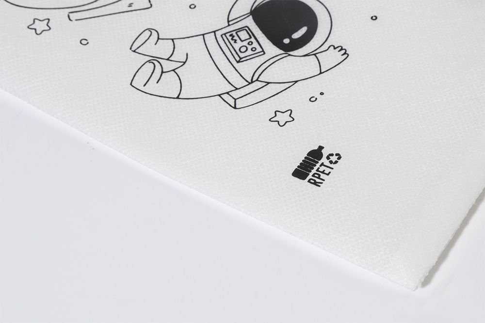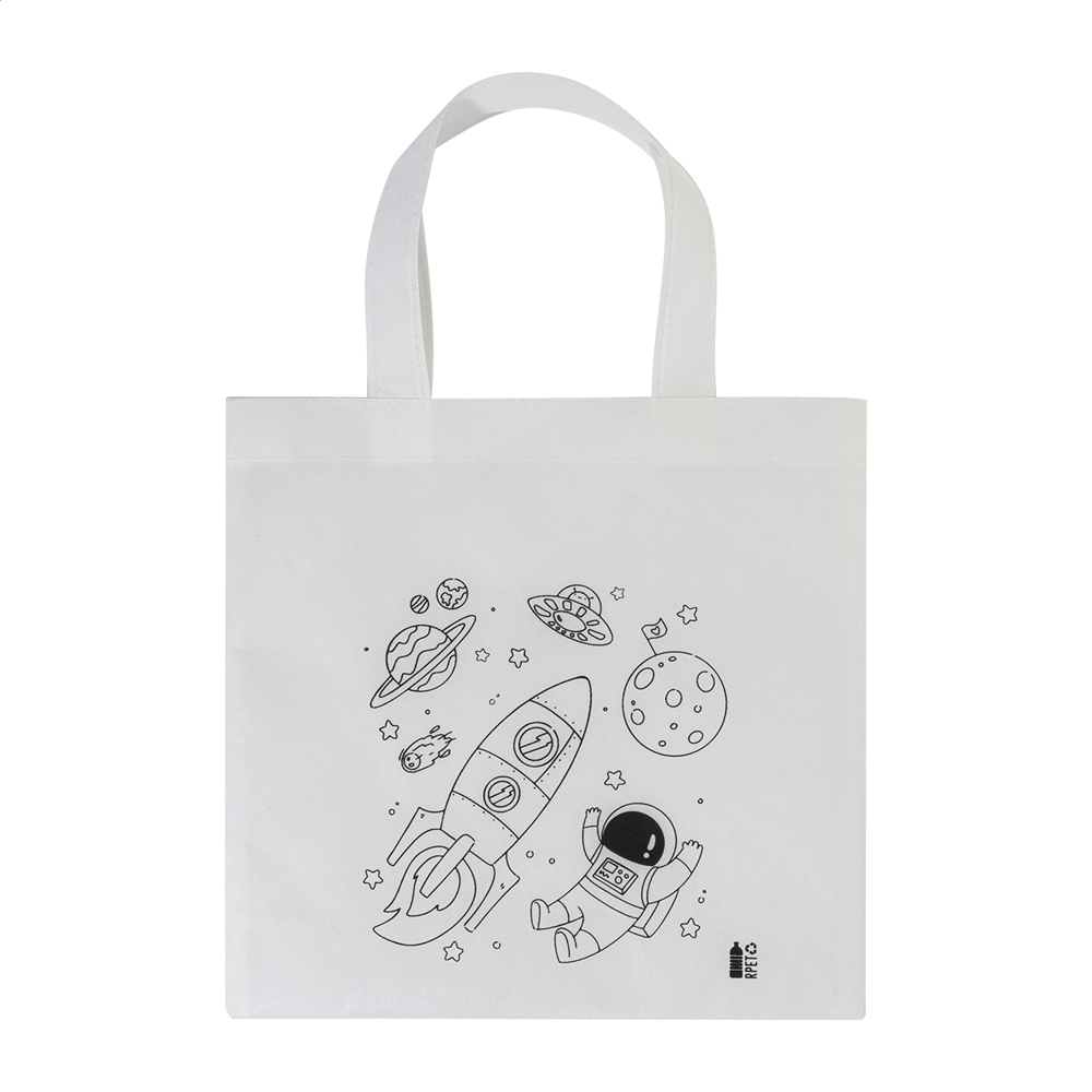 Colouring mini shopping bag in RPET non-woven with 5 crayons.