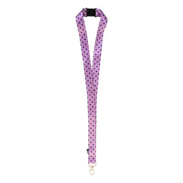 Custom made, RPET lanyard with coloured metal carabiner and safety buckle. With sublimation printed graphics on both sides. MOQ: 100 pcs.