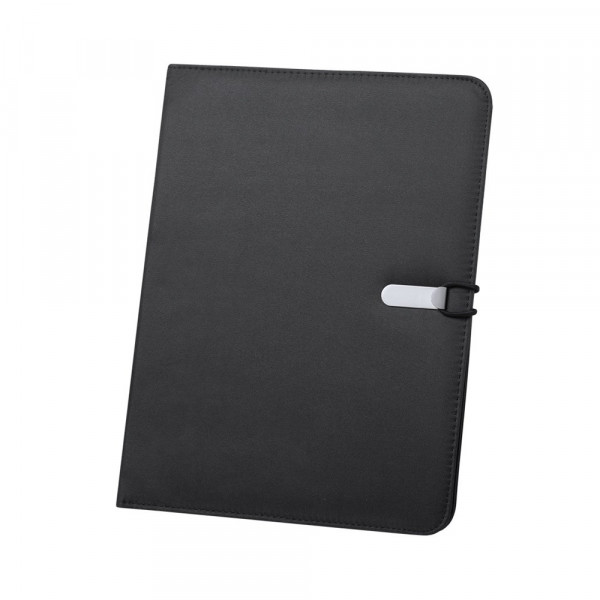 Elegant folder in bright tones. In soft microfiber, with elastic band metal closure especially designed for laser printing. Inside with notepad of 20 blank sheets, 3 flap pockets, card holders and pen holder.